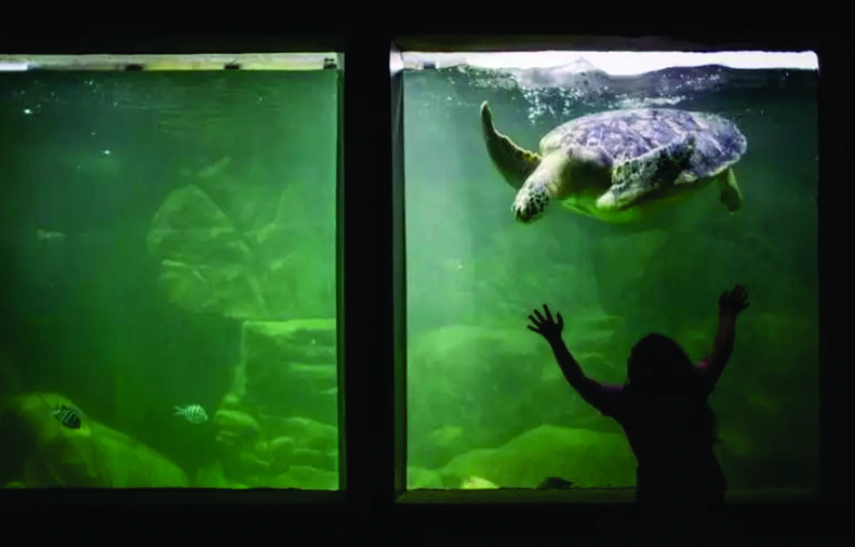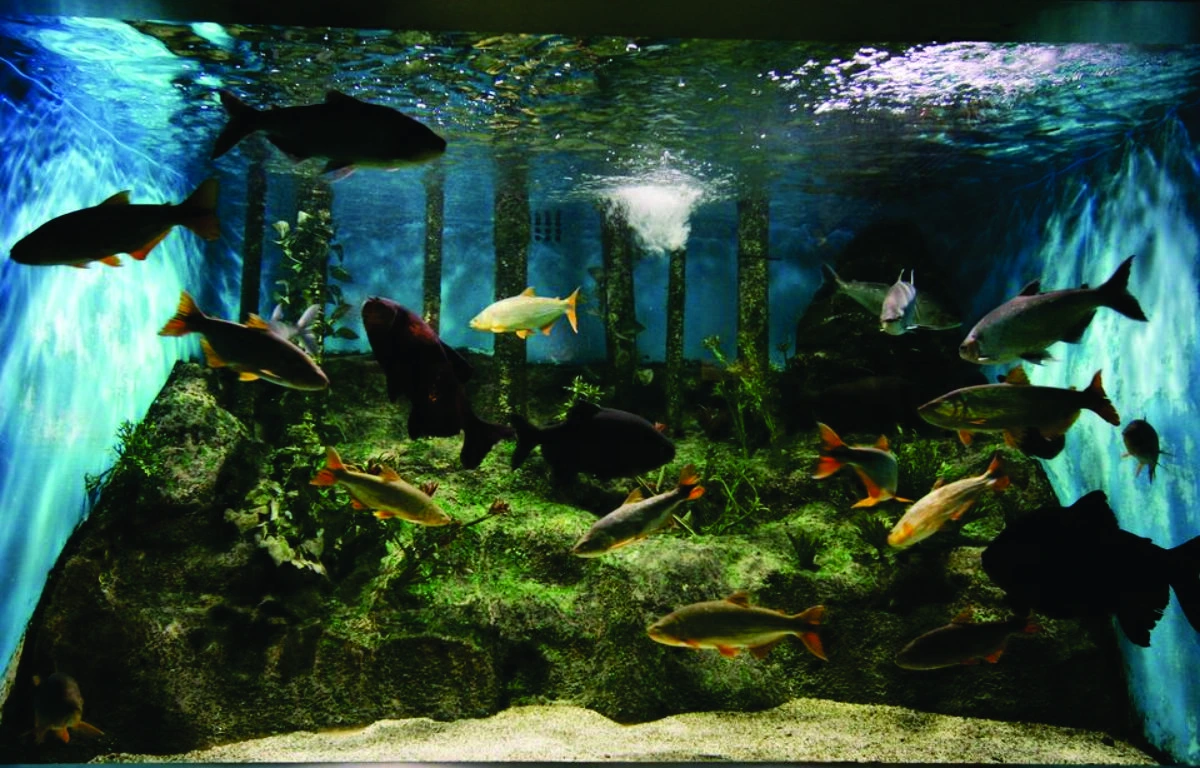 Áreas com tanques ou aquários vivos que reproduzem ecossistemas naturais (ex: lago, mangue) para que os alunos observem espécies, interações ecológicas e adaptem seus conhecimentos.